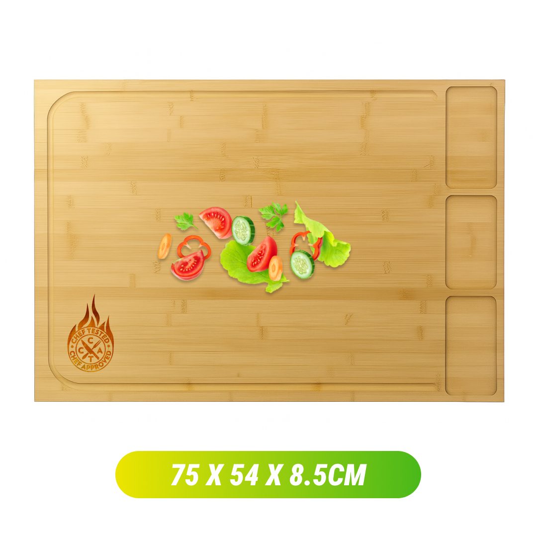 Extra veľká doska BambooCraft ponúka veľkorysú plochu 75 x 54 x 8.5cm, navrhnutú na tradičné použitie a na umiestnenie nad umývadlá alebo sporáky.