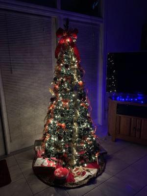 Dobre, takže som starší (nerád hovorím, že som starší) a každý rok som vytiahol ten objemný VEĽKÝ predosvetlený umelý stromček a strávil som hodiny jeho zdobením (žiadne deti, žiadna pomoc). Svetlá nakoniec prestali fungovať, takže som musel pridať aj reťazové svetlá. Potom som uvidel tento vyskakovací strom a rozhodol som sa vyskúšať niečo jednoduchšie a menej nešikovné. A úprimne, milujem to. Trvalo mi dva pokusy, aby som to na prvý raz urobil správne a strávil som desať minút spájaním mašličiek a stužiek a… hotovo! Stojí, je krásny a nemôžem byť šťastnejší. Svetlá to naozaj rozžiarili a pod nimi je dostatok miesta na vloženie malých darčekov, čo je plus. Použil som svoju bežnú stromovú sukňu, ktorá fungovala perfektne. Nemyslím si, že by to udržalo ťažký strom, ale úprimne, je mi to jedno. Veľká, krásna mašľa je elegantná a ľahko sa načechrá, aby zvýraznila vrch. Aj keď ma trochu odradila cena, teraz si myslím, že to stojí za to. Krabička, v ktorej prišiel, je ideálna na uloženie. Odporúčam tento strom každému, koho už nebaví tráviť hodiny a hodiny kladením stromu a potom hodiny a hodiny jeho odkladaním.