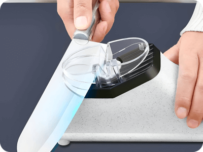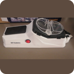 Spôsob použitia: Vložte čepeľ do štrbiny, zarovnajte s uhlovými vodidlami, zapnite elektrický orezávač nožov Razorknife™ a nôž pretiahnite 2-3 krát rovnomerným tlakom, aby ste získali ostrú, profesionálnu hranu.